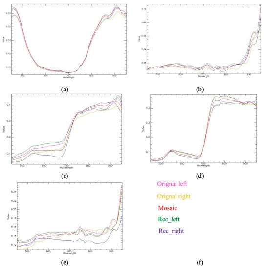 Comparison of typical spectral curves before and after image mosaicking for the urban scape area: the spectral curves of objects of (a) building; (b) water; (c) soil; (d) farmland; (e) road are represented in five colors, the sources of the spectral curves are shown in (f) using the texts in the corresponding colors, where the original_left means the original left image, original_right means the original right image; mosaic means the mosaicked image; Rec_left means the geo-registered left image, Rec_right means the geo-registered right image.