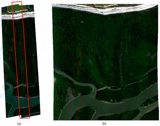 To further evaluate the image fusion methods, the river course and forest images before and after the weighted average fusion are shown in Figure 12 and Figure 13. As shown in the red rectangle on Figure 12 and Figure 13a, the spectral differences that are obvious in Figure 7c and Figure 8b disappear. Figure 13b shows the mosaicked image of multiple image strips of the mangrove forest. The mosaicked images have a good spectral smoothing quality in the overlapped area. It can be seen that the weighted average fusion method can get good results for the spectral homogeneous environments, such as river course and forest areas. With the consideration that the weighted average fusion method is more convenient than the best stitching fusion method, it is suggested to use the weighted average fusion method for the water and vegetation-dominated areas when the data volume is huge. However, when the computation ability is essential, the best stitching fusion method can perform better than the weighted average fusion method.