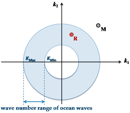 The coordinates of the phase space are shown in Figure 1. In the coordinate system, arbitrary point M represents a current component, CurCn. The blue ring in Figure 1 denotes the range in wave number regarding ocean waves, which ranges from KMin = 0.0071 to KMax = 0.6894. According to Equations (10)–(16), if CurCn is located in the blue ring (e.g., point R) and the amplitude of CurCn (i.e., ) is not equal to zero, CurCn has an influence on the orbital velocity amplitude of WavCn (i.e., ) through the resonance mechanism.