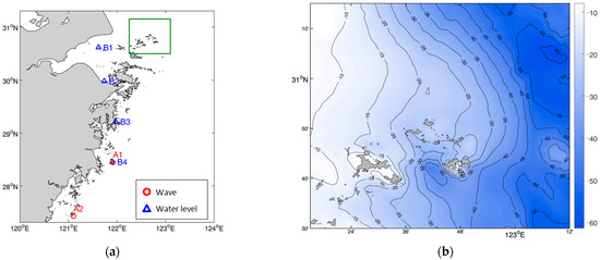 Location of in situ observations and water depths of study domain. (a) Red circles represent location of wave measurements. Blue triangles represent location of water level measurements. The green rectangle represents the location of study domain which is magnified in panel (b); (b) water depth of study domain, i.e., Shengsi area. Unit of measurement is meter.