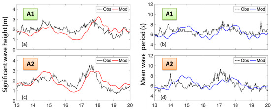 Time series of wave parameters of observations and model outputs. (a,c): Time series of significant wave height at A1 and A2, respectively. Black dots represent measurements. Red curves represent model outputs. (b,d): Time series of mean wave period at A1 and A2, respectively. Black dots represent measurements. Blue curves represent model outputs.