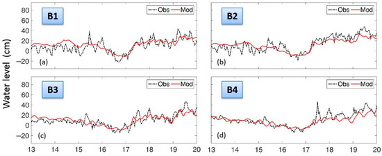 Time series of water level of observations and model outputs. Black dots represent measurements. Red curves represent model outputs. (a–d): Time series of water level at B1, B2, B3, and B4, respectively.