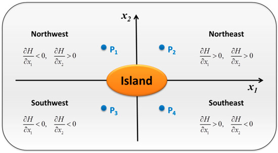 We assume that there is an ideal island with a large gradient of bottom topography in the ocean, as shown in Figure 7. Water depth increases with the increasing distance away from the central island. Therefore, for an arbitrary point in the northwest of the island, e.g., P1, water depth, H, increases gradually along the positive direction of the x1 axis and the gradient of bottom topography at P1. Similarly, water depth, H, decreases along the positive direction of the x2 axis and the gradient of bottom topography at P1. The bottom slope for the ideal island is shown in different directions in Figure 7.