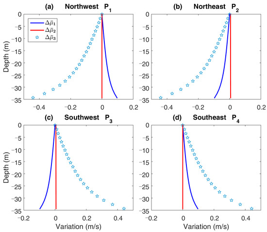 Amplitude variations of orbital motion for main characteristic wave component at points {P1, P2, P3, P4}. Unit of measurement is m3/s. and represent horizontal variation. represents vertical variation. (a) P1 is in northwest of the ideal island. (b) P2 is in northeast of the ideal island. (c) P3 is in southwest of the ideal island. (d) P4 is in southeast of the ideal island.