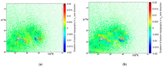 Schematic diagram of bottom slope in Shengsi area. (a) Gradient of bottom topography in x1 axis direction; (b) gradient of bottom topography in x2 axis direction.