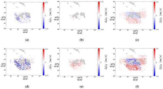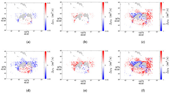 Amplitude variations of orbital motion for main characteristic wave component near Gouqi Island and Shengshan Island at 12:00 on 17 September 2016. Unit of measurement is m3/s. (a–c) represent , and , respectively, with a fivefold bottom slope value. (d–f) represent , , and , respectively, with a tenfold bottom slope value.