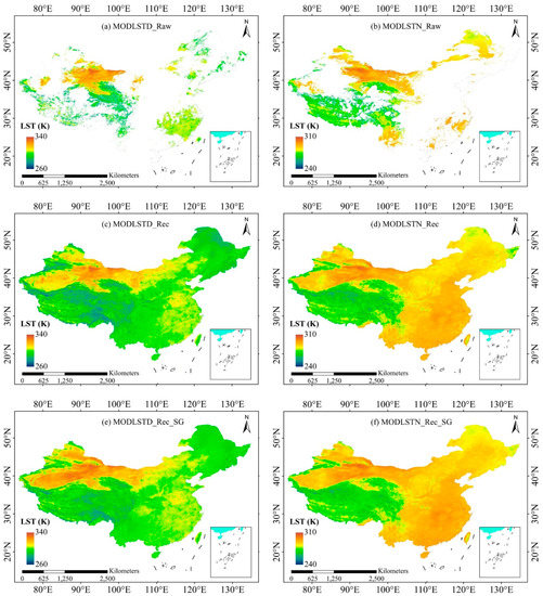 To facilitate the ease of reading, the original daytime LST and nighttime LST of MOD11A1 data, their corresponding reconstructed daytime LST and nighttime LST as well as reconstructed daytime LST and nighttime LST after SG filtering are labeled as MODLSTD_Raw, MODLSTN_Raw, MODLSTD_Rec, MODLSTN_Rec, MODLSTD_Rec_SG, and MODLSTN_Rec_SG, respectively hereafter, and so were the MYD11A1 data.