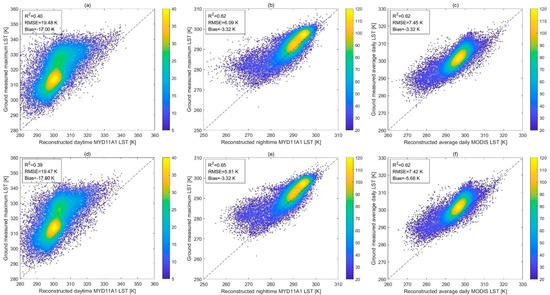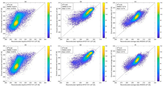 Validation results for reconstructed (a) MYDLSTD_Rec; (b) MYDLSTN_Rec_SG; (c) MODLSTAvg_Rec; (d) MYDLSTD_Rec_SG; (e) MYDLSTN_Rec_SG, and (f) MODLSTAvg_Rec_SG using CMA LST data from June to August 2018. Color bar represents the counts of the points falling in each square.