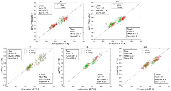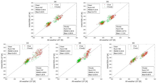 Scatterplots of the all-weather MODIS LST against the ground-measured LST at 5 HiWATER sites: (a) DSL; (b) AR; (c) HZZ; (d) HH, and (e) SDL in 2018.