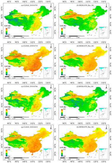 Comparison of the CLDAS LST data at UTC time: (a) CLDAS at 201816703; (c) CLDAS at 201816714; (e) CLDAS at 201816706; (g) CLDAS at 201816618, and the reconstructed MODIS LST data: (b) MODLSTD_Rec_SG; (d) MODLSTN_Rec_SG; (f) MYDLSTD_Rec_SG; (h) MYDLSTN_Rec_SG; 201816703, 201816714, 201816706, and 201816618 (UTC time) denote corresponding time at 11:00 a.m., 22:00 p.m., 2:00 p.m., and 2:00 a.m. on DOY 167 of 2018 (Beijing time) of the four CLDAS LST products, respectively.
