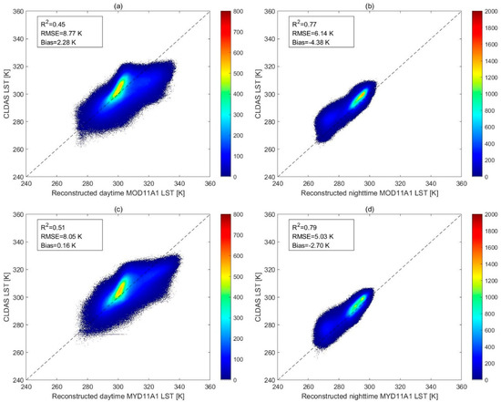 Density scatter plots between the reconstructed LSTs of (a) MODLSTD_Rec_SG; (b) MODLSTN_Rec_SG; (c) MYDLSTD_Rec_SG, and (d) MYDLSTN_Rec_SG, and the corresponding CLDAS LSTs from June to August 2018. Color bar represents the counts of the points falling in each square.