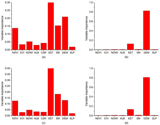 The XGBoost algorithm enables assessment of variable importance to rank their contributions to the established model. The average importance of each predictor for the built XGBoost models during summer time in 2017 and 2018 in this study is shown in Figure 15. Figure 15 demonstrates that the variable importance differs with satellite overpass time. For daytime LST estimation, predictors such as SST, SM, DEM, and NDVI provided significant contributions to the XGBoost models (Figure 15a,c). For nighttime LST estimation, the three variables of DEM, SST, and SM exhibit more importance than the other variables (Figure 15b,d). The variables of SST, SM, and DEM are key inputs in the XGBoost models for both daytime and nighttime LST estimates due to their large contributions. Some studies have explored the relationship between SST and LST to retrieve SST [84,85], and Zhang et al. [51] even used SST data to validate the fused all-weather LST. Sun et al. [56] estimated the effects for SM on the retrieval accuracy of LST, and Jiang et al. [86] estimated hourly SM by using downscaled LST over different urban surfaces. For DEM data, Zhao et al. [26] pointed out there is a notable decreasing trend for surface elevation with LST due to the altitudinal temperature gradients. In the study area, surface elevation is also significantly correlated negatively with LST for both daytime and nighttime.