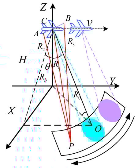 Consider an airborne wide-area radar system with a uniform planar array consisting of two channels, as depicted in Figure 1. The airborne platform flies along the direction with a constant velocity at altitude . and are the squint angle and the elevation angle, respectively. Assuming that is the equivalent phase center (EPC) [41,42,43,44] of the transmitting channel in the airborne wide-area radar system, and are the EPCs of the two receiving channels, respectively. denotes the distance between and . The scene center illustrated by antenna beam is represented by , and is a scattering center near . The instantaneous range from to the scene center is denoted by , and the instantaneous range from to point is . is the instantaneous range between and , and represents the instantaneous range between and . In order to acquire high range resolution, it is supposed that a linear frequency modulated (LFM) signal is used, which can be given by [1,2]
