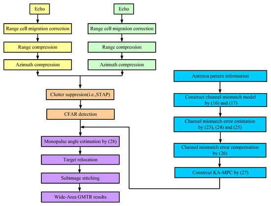 Figure 5 shows a schematic diagram of ground moving target relocation with three adjacent beams. In Figure 5, one target is illuminated three times by the antenna beam, and three azimuth offsets are estimated, with respect to the three beam boresights. The target is relocated on the three azimuth geometry locations based on the conventional GMTR method in Figure 5a, while it is relocated on the same azimuth geometry locations based on KA-GMTR in Figure 5b. This is because the MPC is not correct in conventional GMTR, and the distorted MPC can hardly integrate the three relocation results from three beams to the same azimuth geometry position. However, the KA-MPC is accurate and robust to channel mismatch in real conditions, and it can easily integrate the three relocation results to the same azimuth geometry position. Finally, the detailed processing flowchart of the proposed KA-GMTR algorithm is summarized in Figure 6.