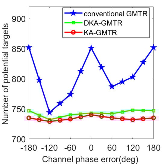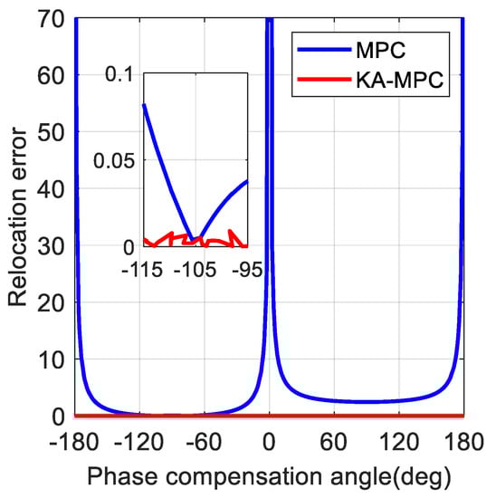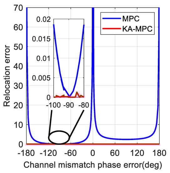 From Figure 9, it can be seen that the target relocation error curve with conventional MPC is close to zero when the channel mismatch phase error compensation factor is about −105 degrees. This is because the final phase angle of the MPC is −90 degrees due to the superposition of the channel mismatch phase error compensation factor and the initial channel mismatch phase error (i.e., −15 degrees). The target relocation error curve has peaks when the channel mismatch phase error compensation factors are near −195, −15, and 165 degrees, respectively. This is because the slope of the imaginary part in the MPC is very small, and the target cannot be well relocated. However, the target relocation error curve with KA-MPC is always small, which means that KA-MPC performs robustly when the channel mismatch phase error varies.