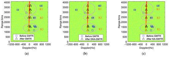 For multiple beams, the potential targets may be relocated many times when it is illuminated by multiple beams in the scanning operation of the antenna. The relocated azimuth position will be in the same position if the relocation method is accurate. In order to make a clear comparison between GMTR, DKA-GMRR, and the proposed KA-GMTR, the target’s relocation results with multiple beams ranged from −30 degrees to 30 degrees are stitched together to form the target tracks. The tracks of the potential targets with different GMTR methods are given in Figure 11. For the sake of fairness, the EFA based STAP clutter suppression operation [12] and Cell Averaging CFAR (CA-CFAR) processing operation [1,2,61,62] are adopted with the same parameter in our experiments. Therefore, the input data for both target relocation methods are the same.