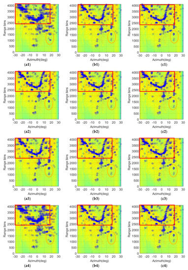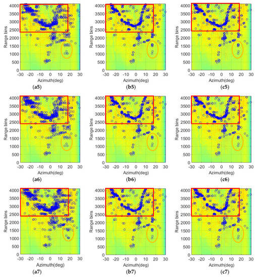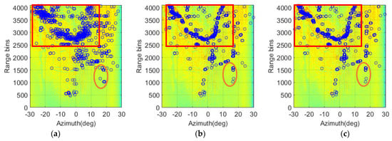As shown in Figure 11a, it is obvious that the tracks of the relocated targets are heavily spread in the azimuth direction (see the red rectangle), and lots of ghost targets blur the real tracks. These ghost targets may be the mirrors of the same target, which are generated by multiple beams when they are performed by GMTR operation. Obviously, these distributed ghost targets increase false alarms and blur the target tracks. By contrast, a small azimuth bias can be found in Figure 11b,c (see the red rectangle). Moreover, the track of the relocated targets in Figure 11c is more concentrated in the azimuth direction than those in Figure 11a,b. This means that the number of the ghost targets is decreased in the proposed KA-GMTR method.