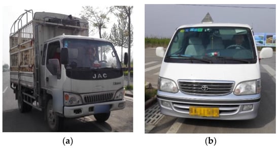 Cooperative vehicle targets of the experiments. (a) Truck. (b) Microbus.