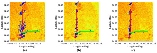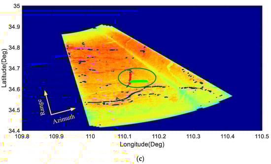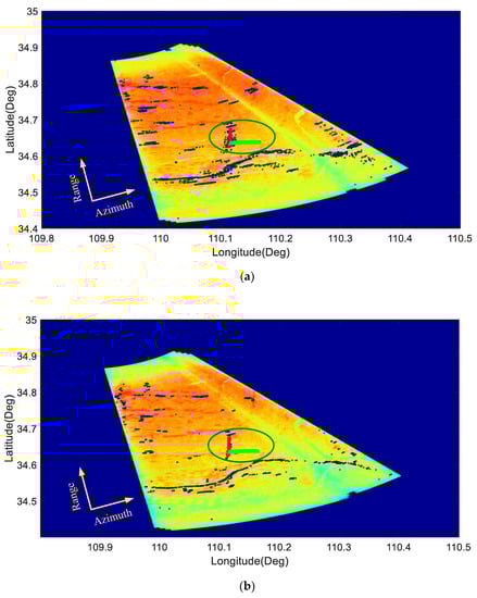 Figure 16 shows the results of the relocated targets on the DBS image using different GMTR methods. In Figure 16a, it can be observed that the detected targets deviate from the roads in the azimuth direction in the conventional GMTR method. However, the detected targets are well relocated on the roads in the KA-GMTR method in Figure 16b,c. Moreover, the distribution of the potential targets based on the conventional GMTR method is wider than that of the DKA-GMTR and KA-GMTR method in the azimuth direction (i.e., longitude). The tracks of the relocated targets in Figure 16c are also thinner and more concentrated than that of the ones in Figure 16b. This is because the channel mismatch is inevitable in practice, and the channel mismatch property degrades the target relocation performance in the conventional GMTR method. However, the channel mismatch and boresight angle are well compensated before performing target relocation operation in KA-GMTR. Therefore, the proposed KA-GMTR algorithm can still maintain high target relocation accuracy under the channel mismatch scenarios. Comparisons of the zoomed-in views for the same region are given in Figure 17.