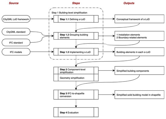 This study developed a framework for converting and simplifying solid building models at two levels, i.e., building level and component level, as shown in Figure 3. (1) At building level, a set of LoDs were specifically defined for solid building models, indicating the building elements that should be included in each LoD. In order to distinguish it from the LoD in CityGML, the LoDs defined in this study for solid models are referred to as s-LoD. The building-level model simplification is mainly about building component filtering. (2) At building component-level, the geometry of building elements, such as doors and windows, was simplified. Component-level model simplification is mainly about geometry simplification. Finally, via IFC-to-shapefile conversion, the conceptually simplified building models can be generated and stored in shapefile.