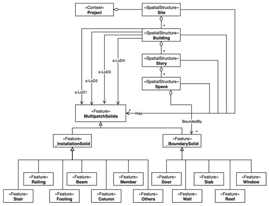 A semantic data model has been developed for solid building models based on this s-LoD concept and is presented in Figure 4 in the form of Unified Modeling Language (UML) diagram. This semantic data model has features from both the IFC data model and the CityGML data model. It inherits the spatial structure from IFC, and groups building elements into two broad classes, i.e., the boundary solids (_BoundarySolid) for boundary-related building elements and the installation solids (_InstallationSolid) for other building elements. As with CityGML, this data model put more weight on the boundary-related building elements, including slab, wall, roof, window, and door.