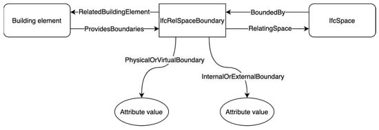 The second method is to use the relationship, which is a relationship between building elements and space (). The relationship between building elements, , and is presented in Figure 6. The relationship has an attribute, , indicating whether a boundary is external or not. This method, however, can only be applied to boundary-related building elements, such as doors, windows, walls, roofs, and slabs.