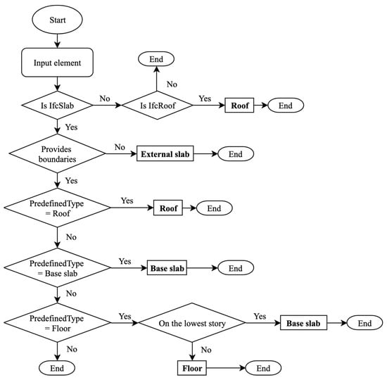 A method for distinguishing various slabs is necessary, as slabs can be used internally or externally for various purposes in buildings, such as floors (internal) and roofs (external) []. After a close investigation into the class, a decision-tree-based method was developed to differentiate slabs, which is presented in Figure 7. This method utilizes several types of semantic information, including the class of an object, its predefined type, whether the object is a boundary, and the building story in which the object resides. Using this method, one is able to distinguish between roofs, floors, external slabs and base slabs. The detailed criteria used for distinguishing slabs are listed in Table 4.