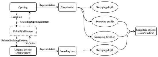 Figure 10 shows the related IFC classes and their relationships for this method. The required parameters for generating simplified doors and windows were obtained from two classes, i.e., openings and bounding boxes of windows/doors. Doors and windows are linked to openings via the relationship. The sweeping profile and sweeping direction can be retrieved from openings, while the sweeping depth can be obtained from the bounding box by using the following equation:
