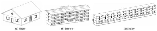 Three IFC building models, representing different building types, were used to assess the proposed framework, including a house model, an institute building model and the model of an apartment building named Smiley, as shown in Figure 13. These models are available online and can be used unrestrictedly []. They were selected in this study because (1) these models contain the most common building elements (see Table 5), especially boundary-related ones, representing varying building types and model sizes, and (2) they were built as (relatively) good examples of quality IFC models, in terms of both geometry and semantics. Please note that BIM models from actual projects were not used for validation in this study, because these models contain project-specific semantics, which may not suit the need for method validation. Not to mention that not all owners would share their models due to confidential concerns.