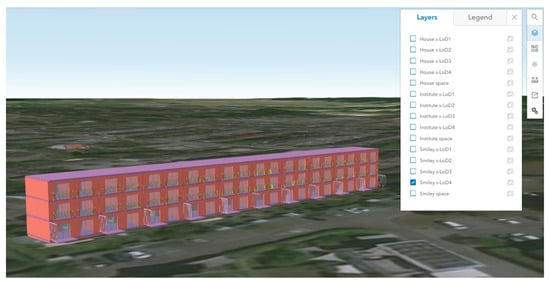 Another limitation is that this study mainly focused on the fundamental data conversion from BIM to GIS and the models generated in this study are currently primarily for visualization, which is the most fundamental requirement for BIM/GIS integration [,]. While some simple application scenarios can be provided, such as 4D simulation as presented in Zhu et al. [], shadow analysis and dimension measuring that are built-in functions of ArcGIS Online, it is necessary to explore other application scenarios.