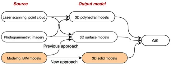 To make it easier to use BIM information in GIS, some researchers investigated the possibility of using solid models. The main efforts were from Amirebrahimi et al. [,], Zhu et al. [,,,], Boyes et al. [], and Isikdag et al. []. These studies realized the conversion of IFC into shapefile-based or Geography Markup Language (GML)-based solid models, using either self-developed tools/algorithms or commercial tools such as the Data Interoperability Extension for ArcGIS (DIA) (Redlands, CA, USA) [] and the Feature Manipulation Engine (FME) (Surrey, BC, Canada) []. However, these studies did not take model simplification into consideration [].