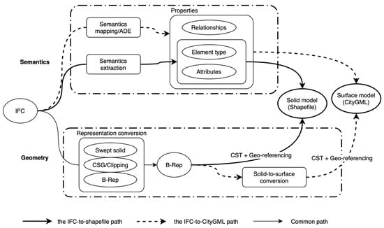 Accordingly, the two most common paths for data conversion are the IFC-to-CityGML path and the IFC-to-shapefile path. Both of these paths need to deal with two major tasks, including geometry conversion and semantics transfer. Geometry conversion deals with the conversion of all types of IFC representations into a form that is accessible by GIS, whereas semantics transfer deals with the transfer of semantic information from BIM to GIS. Please note that the use of different data formats is essentially the use of different model types in GIS, i.e., surface models versus solid models.