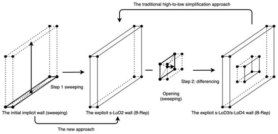 The traditional high-to-low simplification approach can also be applied to BIM models, as presented in Figure 18, where a wall with a hole is used as illustration. To create a s-LoD2 wall from the initial wall using the traditional approach, a geometry engine, such as Open CASCADE Technology (OCCT), can be used to generate the final explicit wall via two steps first (i.e., sweeping and differencing), and then the method can be applied to close the hole. However, it is less efficient compared with the proposed new approach, where the s-LoD2 wall can be directly generated by sweeping without applying the differencing operation.