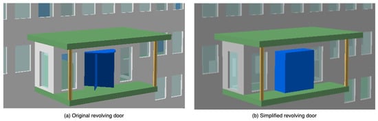 Simplification of the entrance door of the institute building model. (a) Original revolving door. (b) Simplified revolving door.