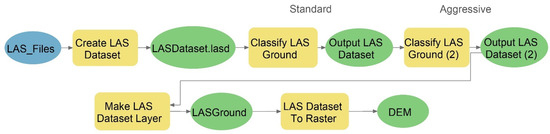 Workflow shown in ArcGIS Pro ModelBuilder for ground classification of LiDAR point clouds and generation of a digital elevation model.