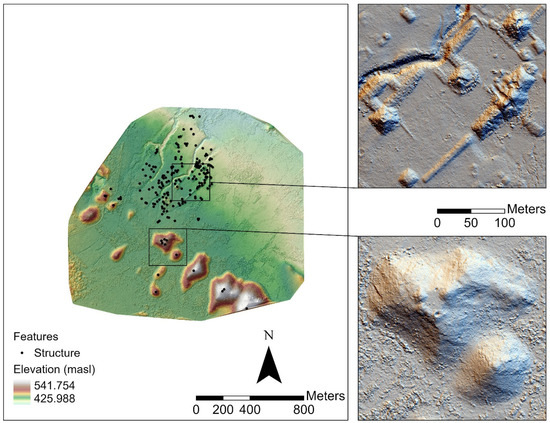 The use of unoccupied aerial vehicles (UAVs), or “drones,” for mapping has increased recently in several fields, including in ecology, archaeology, and industry, due to improvements in battery efficiency, vehicle portability, and diminishing costs [19,20,21,22,23,24,25,26]. Most recent UAV applications in archaeology largely employ principles of low altitude aerial photography and photogrammetry through Structure from Motion (SfM) algorithms to produce 3D models and maps, with additional studies incorporating thermal and multispectral sensors [27,28,29,30,31,32,33,34,35,36,37,38,39]. However, the increasing affordability of lighter weight laser scanning sensors has led to the proliferation of archaeological studies employing UAV-based LiDAR systems. Compared to photogrammetry, LiDAR systems improve terrain mapping in areas of high vegetation cover, alongside the documentation and extraction of above-ground features, including modern structures, archaeological features, and additional layers of canopy [40,41,42,43,44,45,46,47]. While UAV LiDAR applications are increasingly common for studying natural systems and modern infrastructure, we have only recently begun to fully explore their application in archaeology.