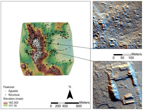 The final mission discussed in this paper is 80 km south of the other areas mapped in 2019. This mission was flown over the archaeological site of Benemérito de las Américas, Primera Sección, a large ancient Maya center located near the confluence of the Upper Usumacinta and Lacantún Rivers [102,103,104] (Figure 9). Excavations and surface collection have recovered ceramics dating to the Terminal Classic period (830–950 CE), although the volume of construction supports the likelihood of earlier occupations, certainly during the Classic period, if not earlier [105,106]. As at Lacanjá Tzeltal, the setting is predominantly flat and cleared of vegetation, except for portions of the north–south trending ridge that contain most of the monumental site core. Settlement, however, extends toward the edges of the mapped area along the ridge’s spurs. The settlement is notably dense, including 771 structures identified in the GatorEye data, oriented around the main ridge or acropolis. In outlying areas of the site, these structures cluster around 43 household aguadas, or reservoirs, also used as borrow pits for building material.