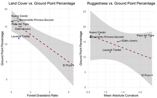 Scatter plots with trend lines and confidence intervals showing the relationship between ground point percentage and land cover or ruggedness, respectively.