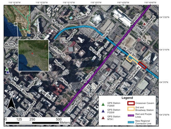 Adjacent to the crossover cavern is the 2nd and Broadway station, for which excavation was completed in July 2018 using the cut and cover method. Sequential excavation of the crossover cavern took place from 30 May 2018 to 14 March 2019, after which 30 and 46 cm liners of shotcrete and concrete, respectively, were installed. Sequential excavation follows principles of the observational method, requiring a complex monitoring system with extensive instrumentation, including a network of GSSPs and automated total stations capable of making settlement measurements with an accuracy of ±0.7 mm []. This monitoring system captured an increase in surface subsidence coincident with the crossover cavern excavation. Between June 2018 and February 2019, a vertical settlement magnitude of 1.8 cm was measured along 2nd Street directly above the cavern by GSSP (Figure 2), with peak deformation rates exceeding 2.5 cm/yr []. Subsidence rates measured in this location during 2018–2019 are much higher than regional subsidence rates typically found in southern California due to anthropogenic activities, including groundwater pumping and oil extraction [,]. The nearest available GPS data from stations MTA1, FGNW, and FGSW (Figure 1) possess average subsidence rates of −0.29, −0.16, and −0.3 cm/y, respectively, for all available data between 2009 and 2021 (Figure 3) [,], indicating that accelerated deformation rates above the crossover cavern are primarily caused by excavation activities.