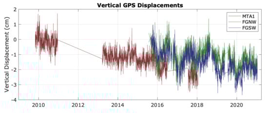 GPS data from stations MTA1, FGNW, and FGSW from 2009 to 2021.