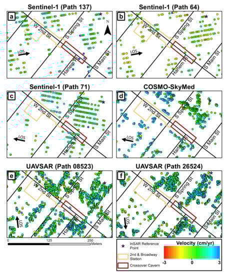 UAVSAR data produced more PS pixels along the crossover cavern, especially on the westbound side of 2nd Street toward Spring Street (Figure 4e,f). InSAR and GSSP data are in good agreement in this area aside from point P7, which possesses the largest overestimation of settlement by the InSAR data (Figure 8b and Figure 9g). The increase in InSAR measured subsidence at P7 takes place during the time period in which UAVSAR data are available (16 November 2018 to 21 February 2019). The overestimation can be attributed in part to the relatively poor temporal resolution of the UAVSAR datasets, as only four scenes are available during the period of interest. Such coarse temporal resolution increases the difficulty of accurately calculating and removing atmospheric and other noise sources and makes transient surface changes more difficult to identify. This difficulty is visually apparent in the North-South displacements (Figure 6b), which are primarily controlled by the UAVSAR datasets. The calculated North-South displacements resemble that of a subsidence signal, where horizontal motion is directed toward a plane centered at the point of maximum subsidence, but the N-S horizontal deformation is spatially inconsistent relative to the smoother E-W horizontal displacements (Figure 6a) that are better captured by satellite data with higher temporal resolution. Additionally, L-band wavelength sensors, while able to maintain coherence over longer timespans than C-band or X-band sensors, are known to possess less accurate LOS deformation measurements compared to shorter wavelength sensors []. Other sources of artifact inducing noise may include thermal expansion and contraction of buildings [,,], surface changes due to ongoing construction related to the cut and cover of the 2nd and Broadway station, interpolation error within the LOS time-series input, other urban noise [,], or discrepancies related to wavelength-dependent scattering phenomena []. The impact of artifacts within the dataset could be partially mitigated by applying a 4D filter that can remove random noise from low magnitude subsidence events []. Timing of the initiation of subsidence could be better constrained by analysis of archival SAR data.