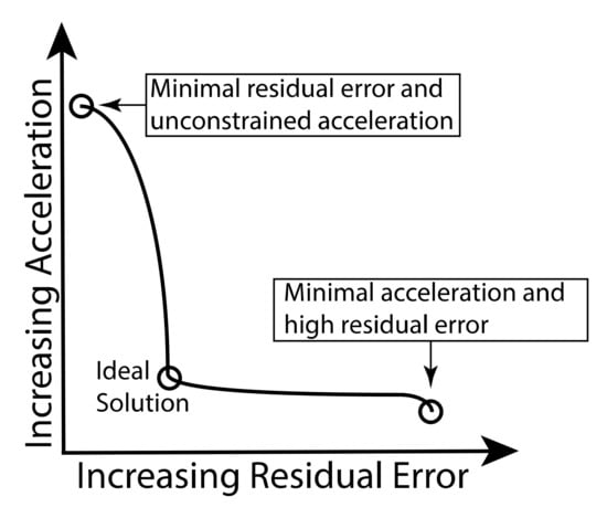where is the weighting factor determined by the inverse distance to the nearest PS pixel, and and are the radar incidence angle and LOS azimuth, respectively, of the LOS displacement time-series []. Equations were solved in the least-squares sense by using first-order Tikhonov regularization []. Regularization was achieved by imposing constraints to minimize the acceleration of 3D displacements between acquisitions. These constraints were imposed using the L-curve method [,], whereby a range of regularization coefficients are applied to the input system of linear equations. This creates a series of potential solutions, ranging from solutions that minimize residual error without constraining displacement acceleration to solutions that minimize acceleration but possess greater residual error (Figure 5). All potential solutions plot along an L-shaped curve, with the optimum solution located at the bottom left corner. The solution found at the corner of the L-curve is optimized because it provides the most precisely balanced solution between minimizing residual error and satisfying the side constraint, which in this case is the minimization of displacement acceleration. This analysis was performed using the regularization tools Matlab package []. Once estimated, the calculated velocities were independently time-integrated to extract a single 3D deformation time-series.