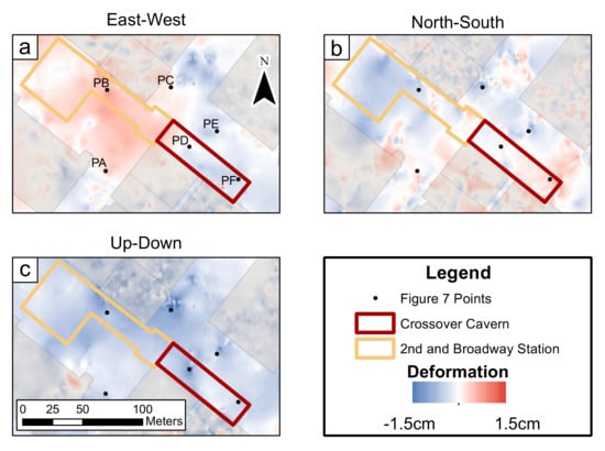 Calculated 3D deformations from all InSAR datasets reveal the temporal and spatial extents of subsidence related to excavation activities (Figure 6). Horizontal and vertical deformations were observed to reach beyond the boundaries of both the crossover cavern and the ground-based dataset, encompassing an area of approximately 200 m by 150 m. From 16 November 2018 to 21 February 2019, the period of time during which UAVSAR data are available to constrain N-S deformation, a maximum vertical deformation of 1.2 cm was measured directly above the crossover cavern near point PD (Figure 7). As this location is near the center of the subsiding area, observed deformation is primarily vertical, and very little E-W or N-S horizontal deformation is calculated. Maximum horizontal deformations reach 0.5 cm at points PF, PC, PB, and PE for the North, South, East, and West deformation components, respectively. Calculated horizontal displacements are consistent with a subsidence event, where horizontal motions centered around the vertical settlement are directed towards each other. Localized pockets of vertical subsidence, such as the area near point PC, coincide with spatially variable horizontal deformation. Computed N-S deformation contains a greater degree of spatial variability than E-W deformation. All deformation components contain greater amounts of noise and spatial heterogeneity on buildings.