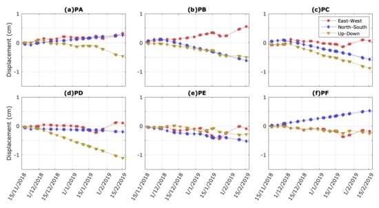 (a–f) East-West, North-South, and Up-Down deformation components of point locations indicated in Figure 6.