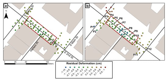 (a) Mean residual deformation (b) maximum residual deformation after differencing ground-based and InSAR vertical deformation data. Negative residuals, shown by cooler colors, indicate underestimation. Positive residuals, shown by warmer colors, indicate an overestimation of settlement by InSAR. Deformation time-series for points P1–P12 shown in Figure 9.