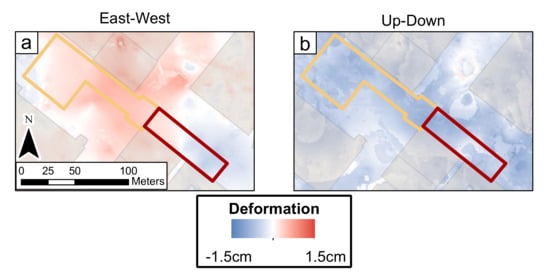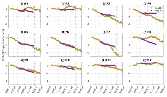 All available UAVSAR acquisitions were used in order to produce a deformation time-series, but only four acquisitions were made during the time period of interest, on 16 November 2018 and 21 February 2019 for both UAVSAR data paths. Due to the poor temporal resolution of the UAVSAR data, they are only available to constrain N-S horizontal deformation during the time between these acquisitions. Before 16 November 2018 and after 21 February 2019, N-S acceleration values were assumed to be negligible in order to account for the low sensitivity of satellite InSAR measurements in this direction []. To assess the accuracy and precision of the applied method, calculated vertical deformations from InSAR data were compared to and differenced with those from a network of GSSP that captured the subsidence event in real-time.