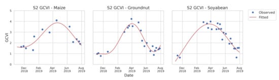 Examples of the harmonic model smoothing for three different crop types (maize, groundnut and soybean) using a Sentinel-2 GCVI time series in Malawi. The blue points represent the observed Sentinel-2 GCVI time series at a specific location in Malawi through November 2018–July 2019. The red line represents the harmonic fitted GCVI time series.