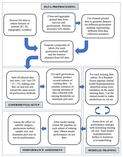 - Feed the modeling pipeline with each dataset in a sequence designed to emulate hypothetical scenarios of field data collection (varying the number of observations, the plot geolocation method, and the minimum plot size);