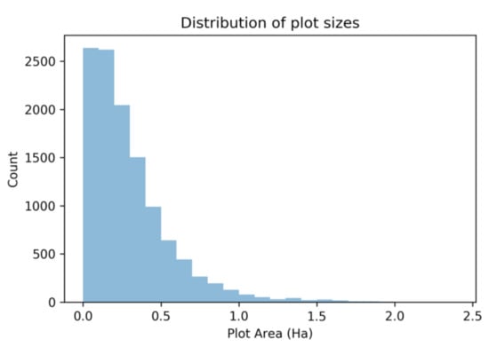 Plot size can influence modeled crop yields due to rounding errors [3,5]. Models trained on observations that exclude very small plots (e.g., <0.2 ha) commonly perform better because smaller plots can include satellite data pixels that are affected by heterogeneous land use around plot edges. In order to conduct experiments on the effect of a minimum plot size threshold on crop classification accuracy, we created four copies of the stratified and split dataset, where training data was filtered to include only plots with areas greater than 0 ha, 0.05 ha, 0.1 ha, 0.15 ha and 0.2 ha. We retained plots of all sizes in the validation and test subsets to evaluate each model with real-world plot size distributions. The histogram in Figure 4 below shows the distribution of plot areas. Testing the effect of plot area thresholds in Ethiopia was not possible due to the absence of plot boundaries in the survey data.
