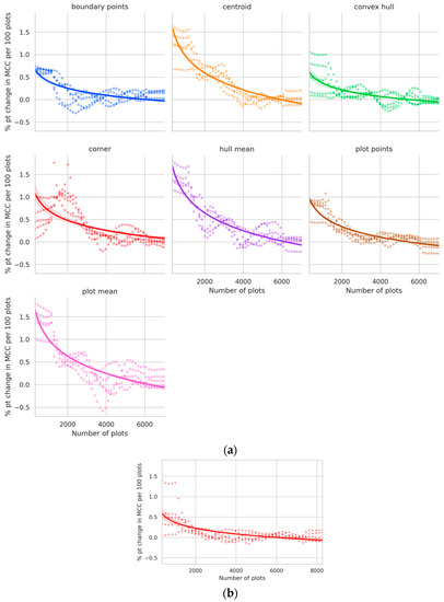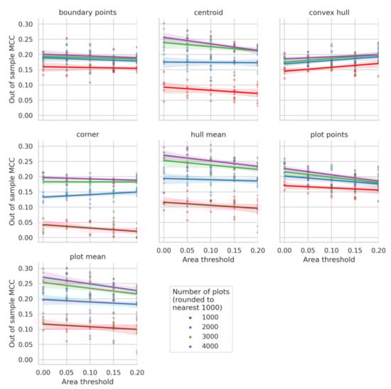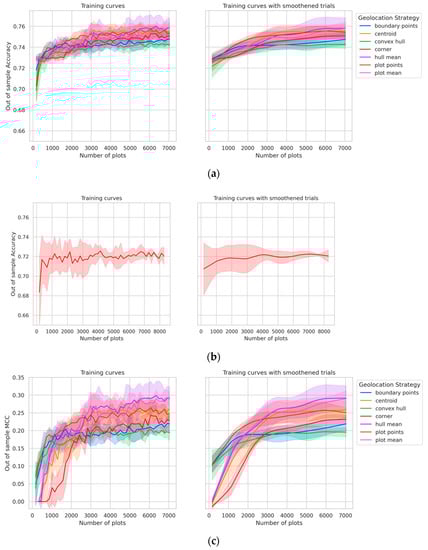 Fifth, if only a single GPS point is to be gathered by data collectors, that location should be near the center of the plot rather than at the plot corner. However, georeferencing plot centroids should be understood as a third-best strategy for remote sensing model training purposes. The findings suggest that classification performance almost always peaks before or at around 4000 plots under the preferred geolocation strategies, corresponding to roughly less than 60% of the training data. As such, it is better to collect high-quality plot boundaries from 4000 plots as opposed to corner points from 7000 plots.